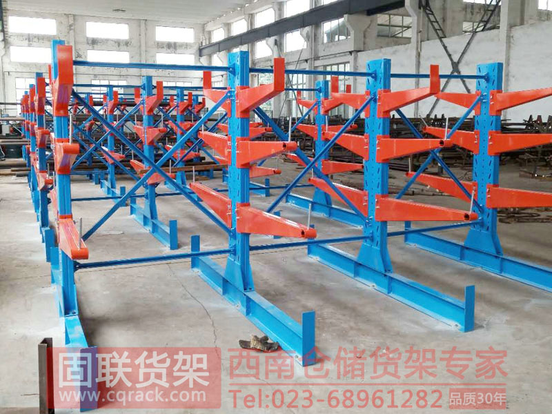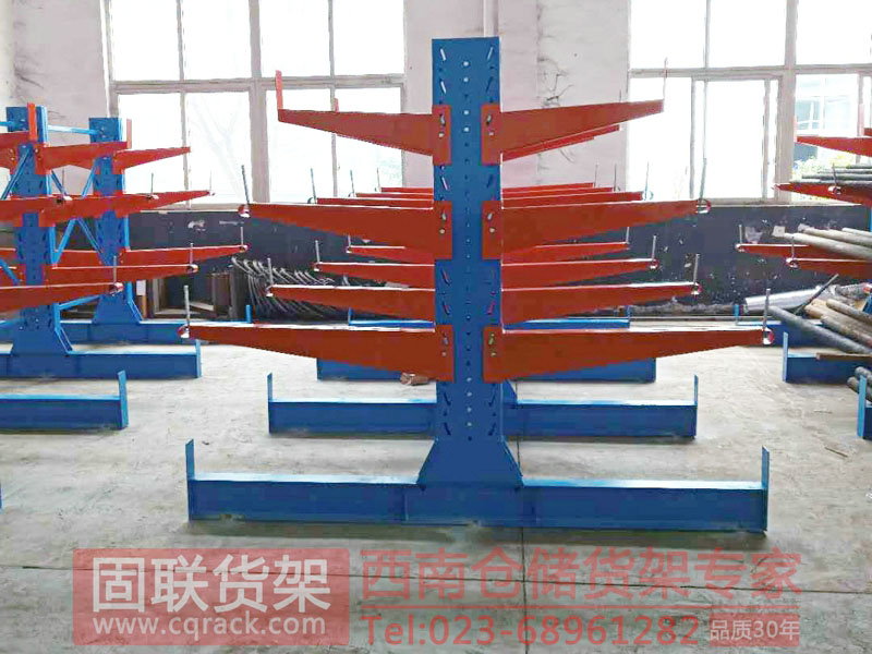 某公司重型懸臂貨架,四層雙面存放懸臂式貨架,從上到下,懸臂依次增長,方便存取。